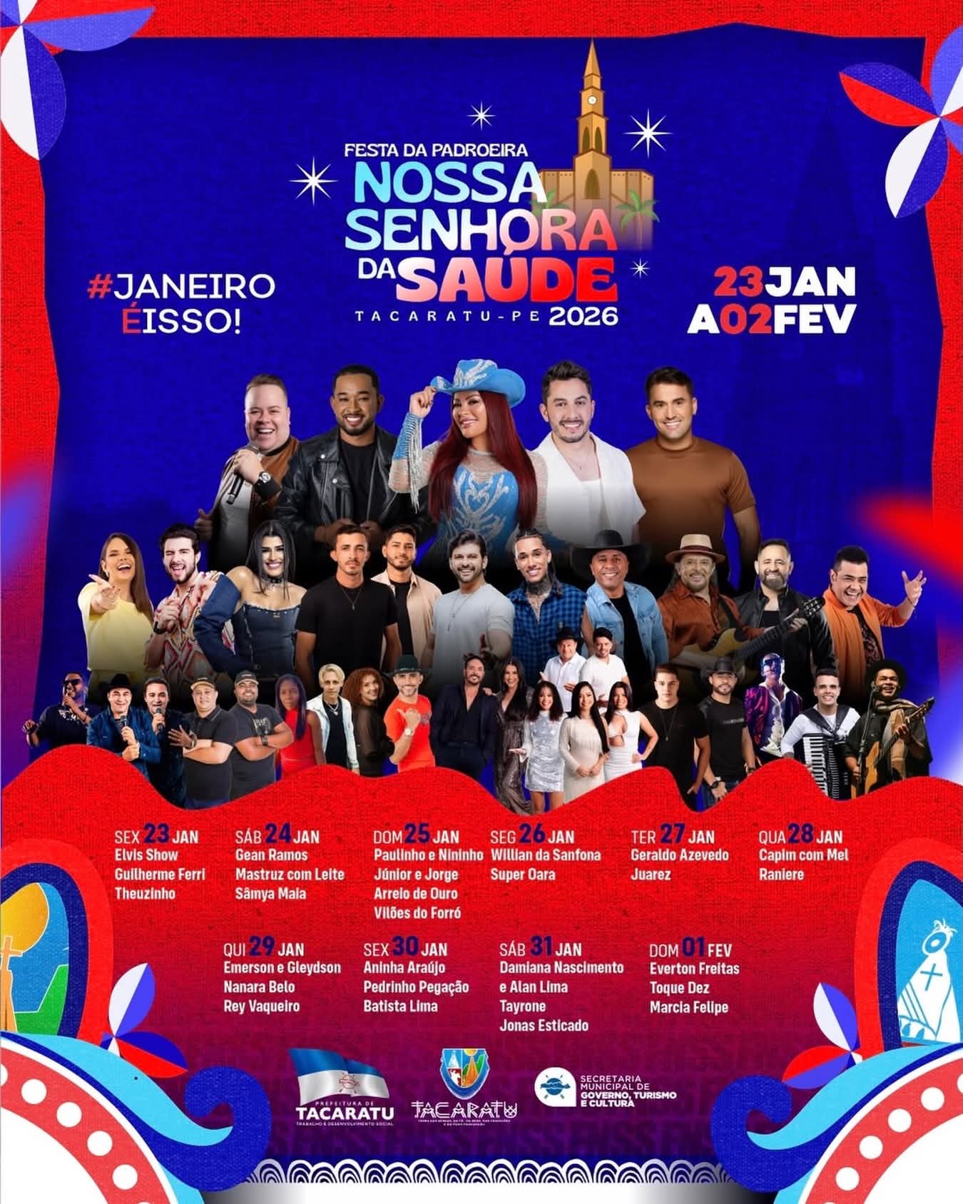 A Prefeitura de Tacaratu divulgou a programação oficial da Festa da Padroeira Nossa Senhora da Saúde 2026