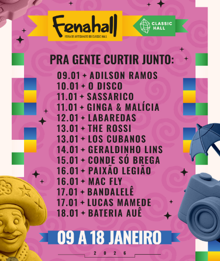 A Fenahall chega à sua 23ª edição, e será realizada de 9 a 19 de janeiro de 2026, no Classic Hall, em Olinda, na Região Metropolitana do Recife. O evento, que já se consolidou como um dos maiores do setor no Nordeste, reunirá expositores de várias partes do Brasil e do mundo, com artesanato, decoração, moda, gastronomia, cultura e muito mais.